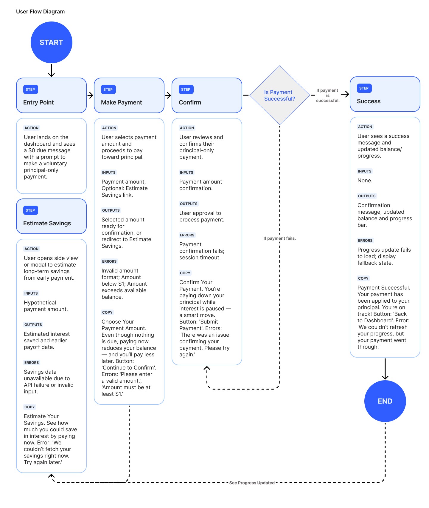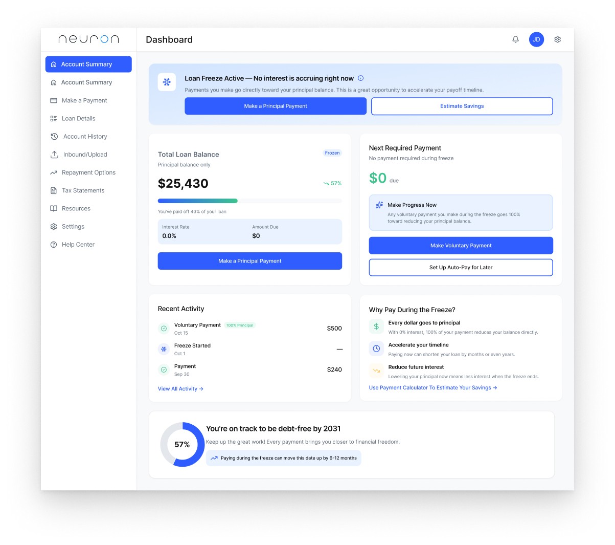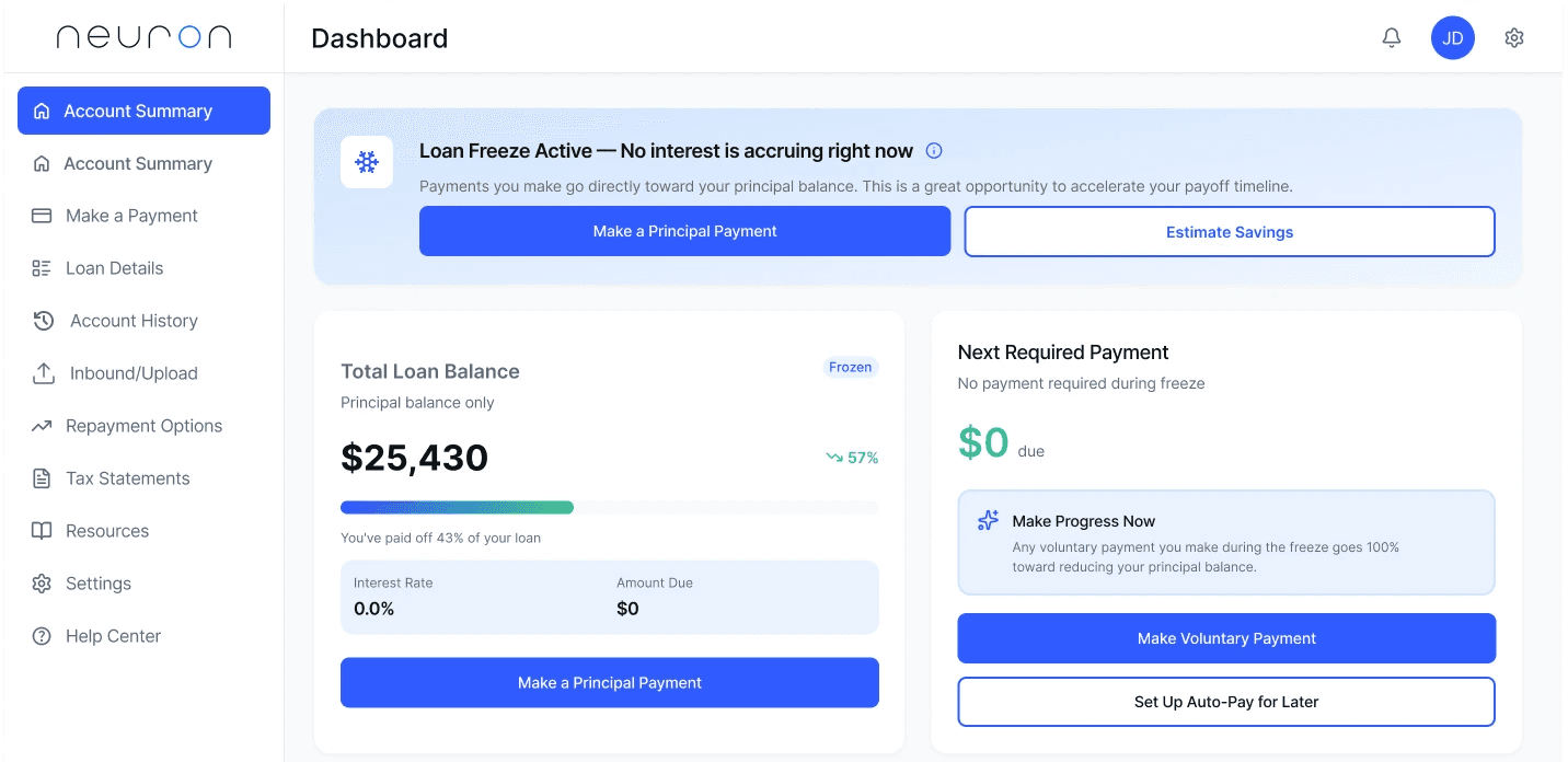 A modern redesign of a student loan portal homepage that communicates clarity, calm, and opportunity. When loans are frozen, users see $0 due but are guided to make principal payments that directly reduce their balance while interest is paused.
