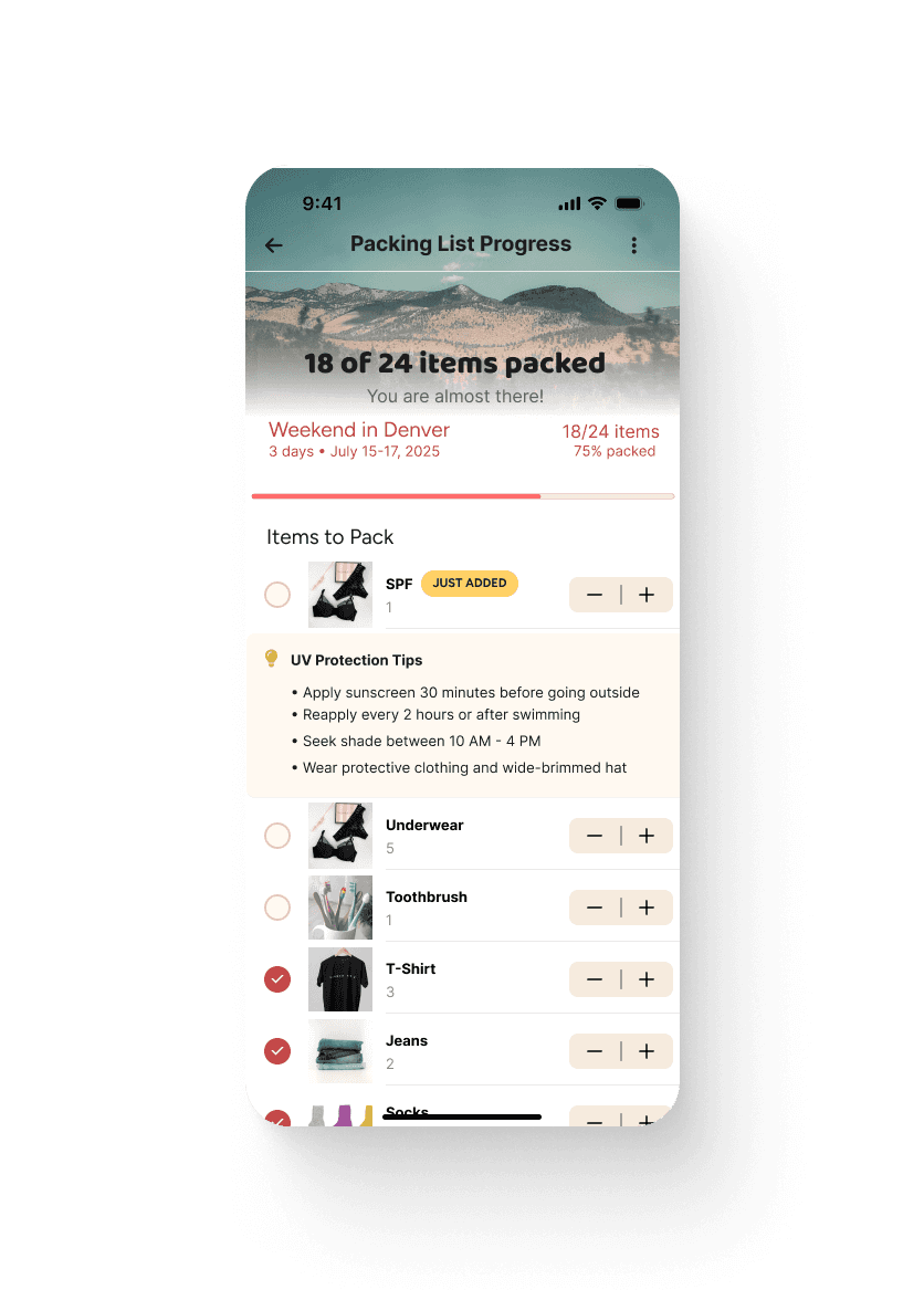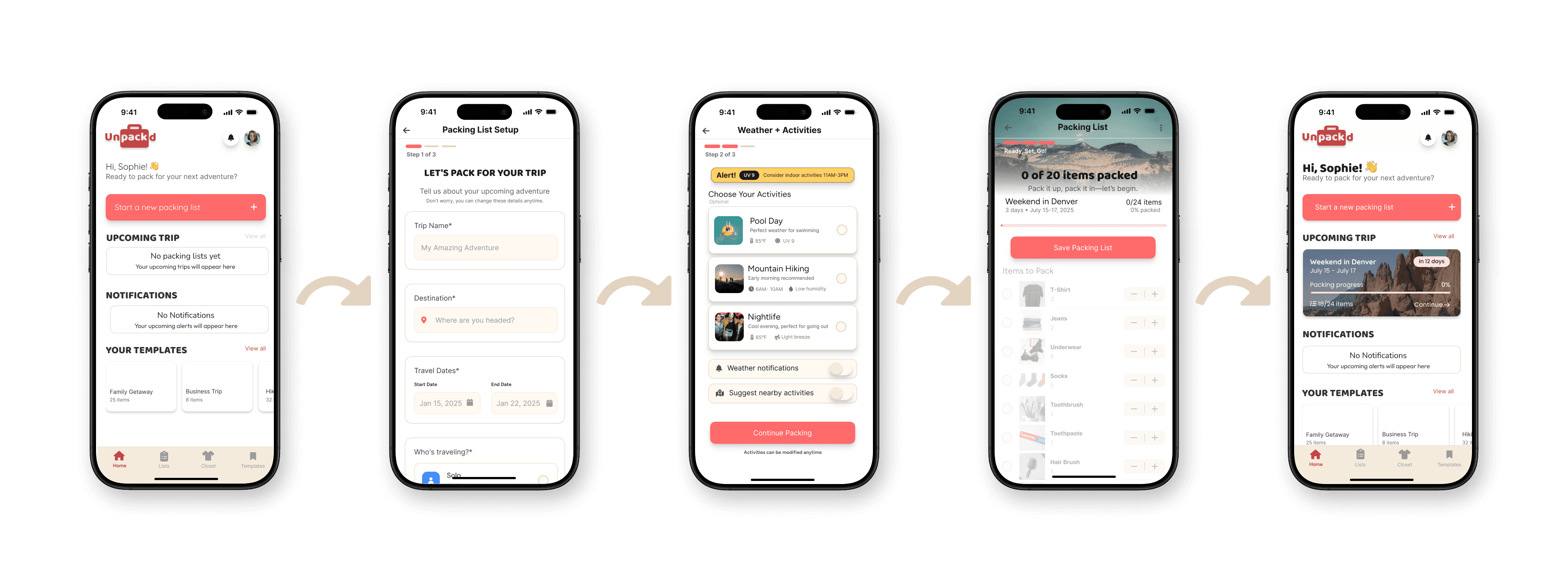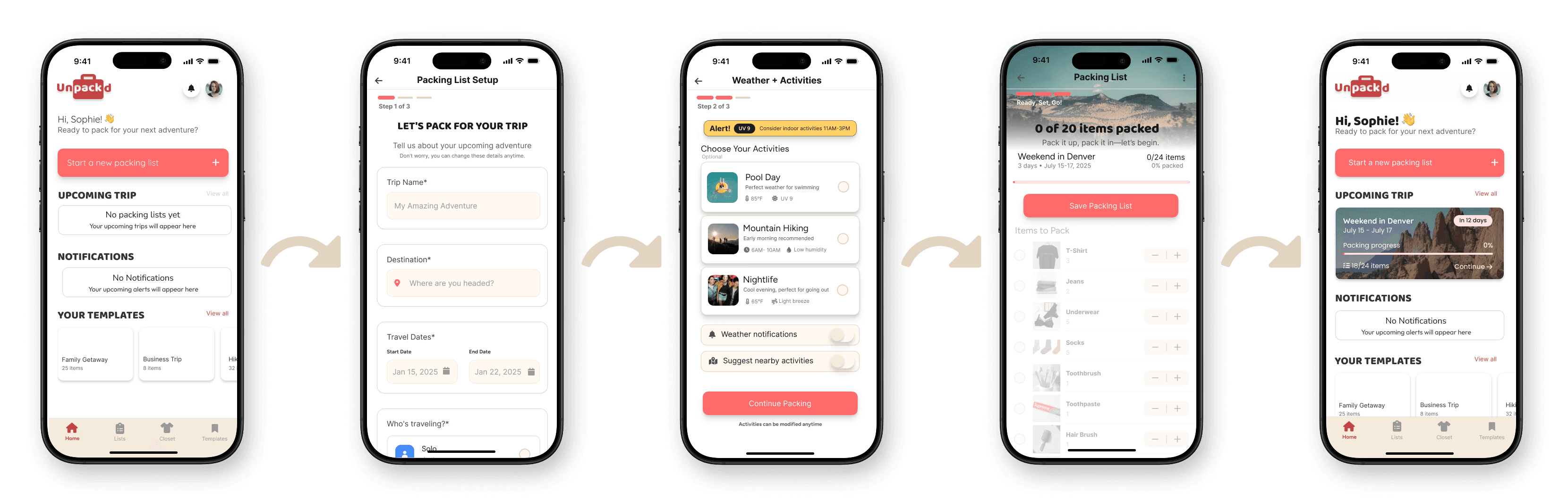 See how Unpackd guides users from trip setup to packing with progress and control at every step.