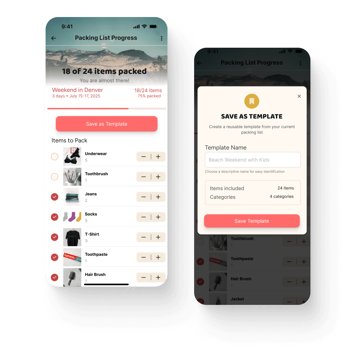 Customization: Users can name templates to match personal trip patterns (e.g., “Beach Weekend with Kids”).